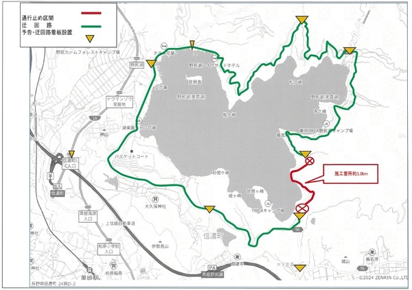 野尻湖周遊道路(県道96号線)野尻湖東側が電気工事の為、下記時間帯通行止めとなりますのでご注意ください。