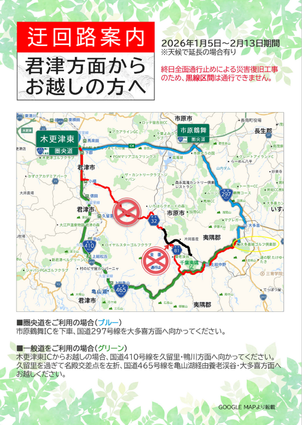 [君津方面よりお越しのお客様へ] 迂回路のご案内