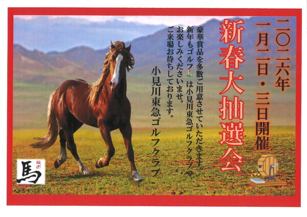 平素より当クラブをご愛顧賜り、誠にありがとうございます。 2026年1月2日(金)・3日(土)の2日間 ☆ご来場者企画といたしまして、 🎍新春大抽選会🎍を開催いたします!! 新年の運試し!! お一人様一回ガラポンを回していただきます。 豪華賞品を多数ご用意しておりますので 2026年🐎初打ち⛳も小見川東急ゴルフクラブにて、 ラウンドをお楽しみ下さいませ。 皆様のご来場心よりお待ち申し上げております。