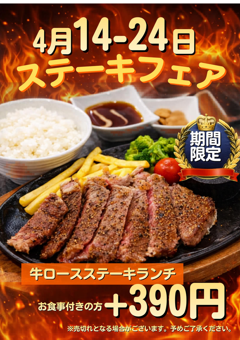 美味しさが鉄板の上で踊る。 期間限定のステーキフェアがいよいよスタートします! ゴルフと共にお食事もお楽しみください。 更に!今なら「時間枠限定 ステーキ差額無しプラン」もご用意いたしました。お得に満喫するなら公式WEB予約をぜひご覧ください。 ■ 開催期間 2026年4月14日(火) 〜 4月24日(金) ■料金 お食事付きでご予約のお客様 差額+390円 通常価格2,090円税込